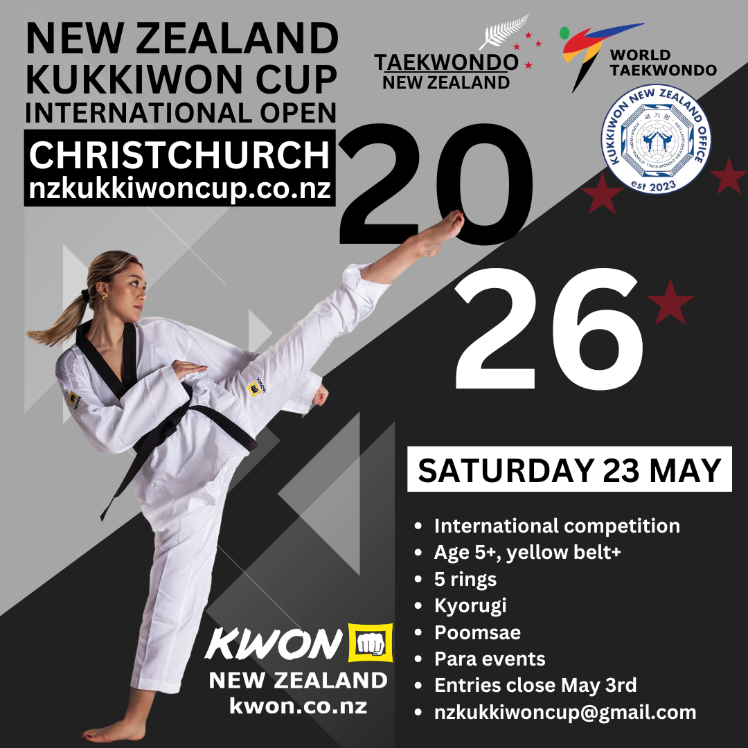 KWON NZ is proud to be sponsoring the TNZ Kukkiwon Cup being held in Christchurch on Saturday May 23rd.